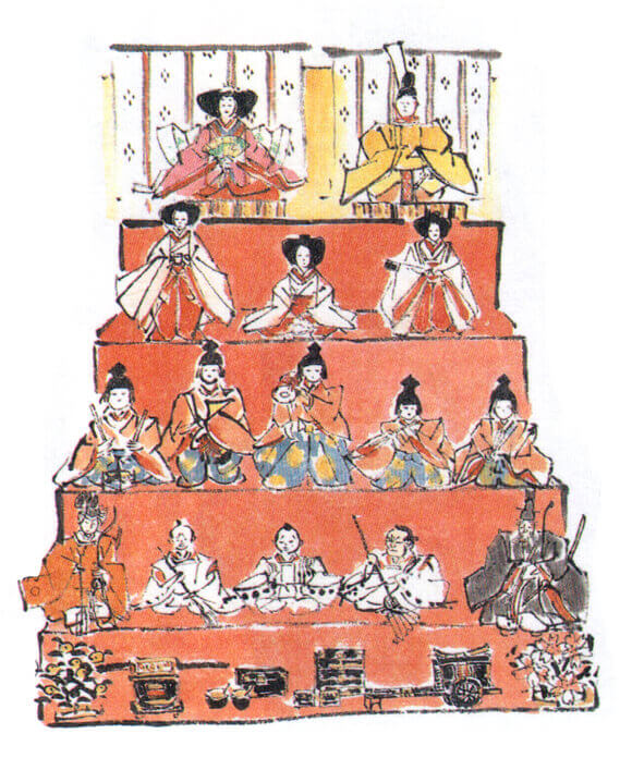 平安王朝の「ひひな」が、雛人形をはじめとする日本の伝統的なお人形の源流といわれています。室町時代に入ると「ひひな」遊びは桃の節句の伝統行事となり、江戸時代には宮廷行事から庶民がわが子の幸せを願う伝承行事となっていきました。お嫁入りの折りに雛飾りを嫁ぎ先へ持参するという風習も江戸の中期からはじまったようです。
